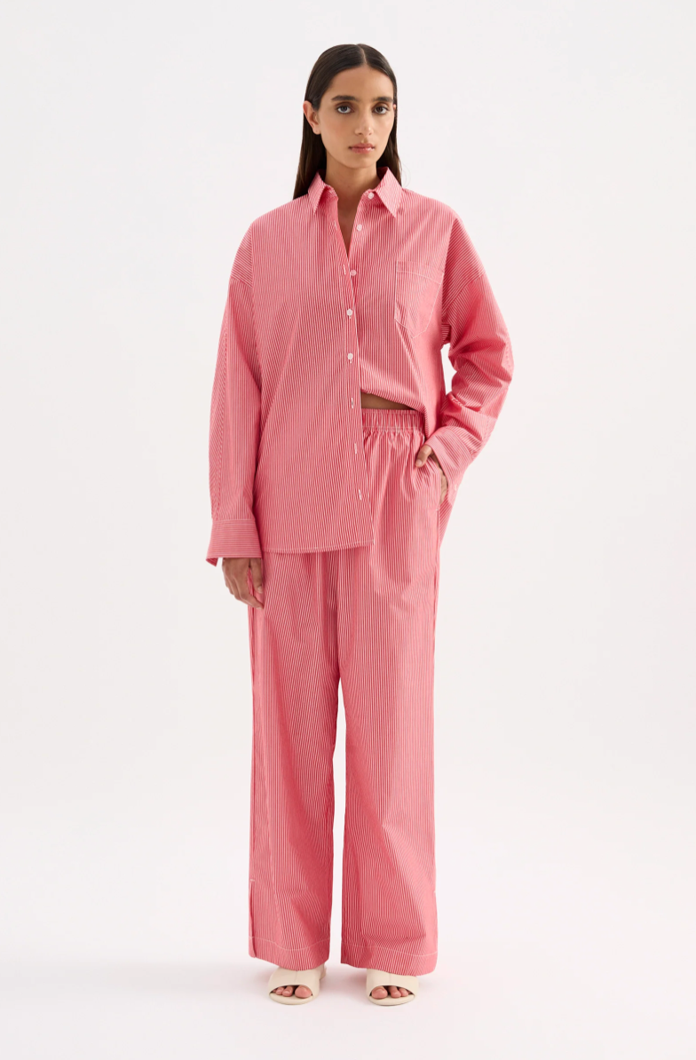 The Anouk Stripe Shirt is made from an organic cotton poplin which has be washed for a smooth, crisp hand feel in a seasonal red mini stripe. The silhouette is oversized throughout with length finishing below the hips. Features include classic shirting details with front patch pocket and Nude Lucy branded buttons.