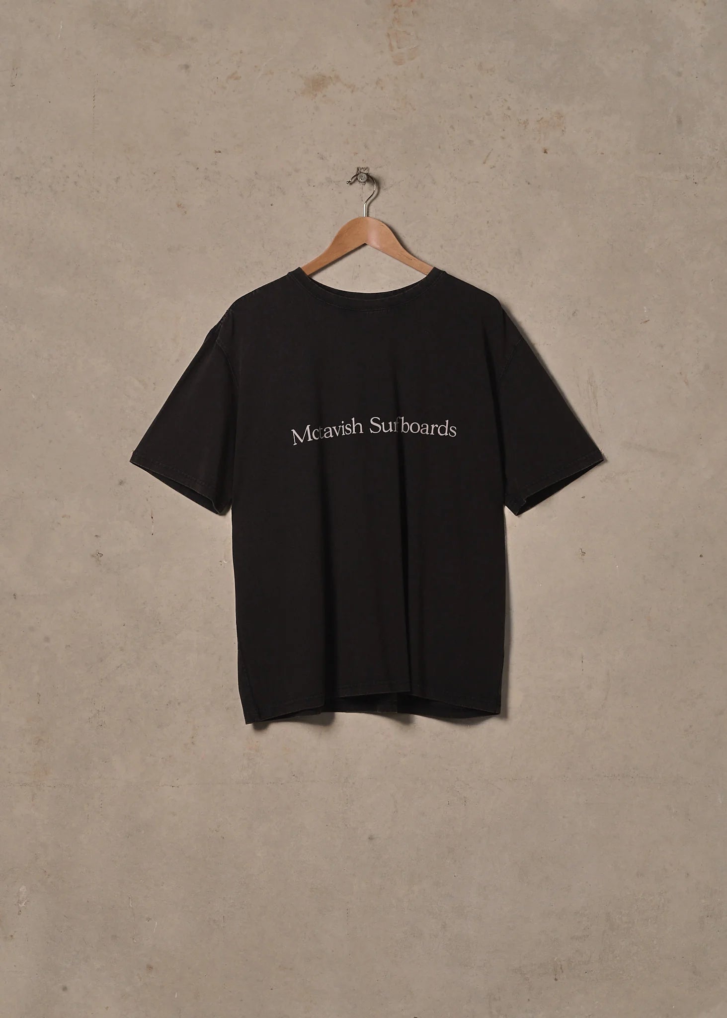 Made from our heaviest organic cotton jersey ina wide, boxy fit, with a seriffed out Mctavish Surfboards across the chest. Available in Black & White.