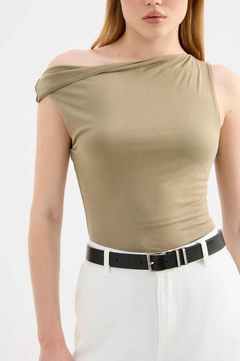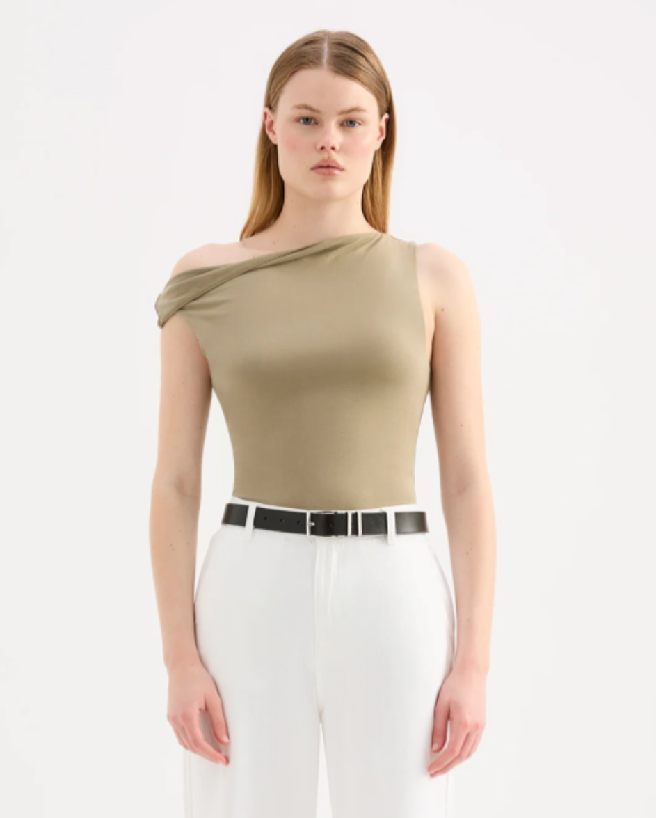 The Chelsea Top is made from a midweight modal fabrication which has a soft, slinky hand feel. The silhouette is a flattering close and finishes at the hips. Features include an asymmetric neckline, with a twist on the off shoulder sleeve.