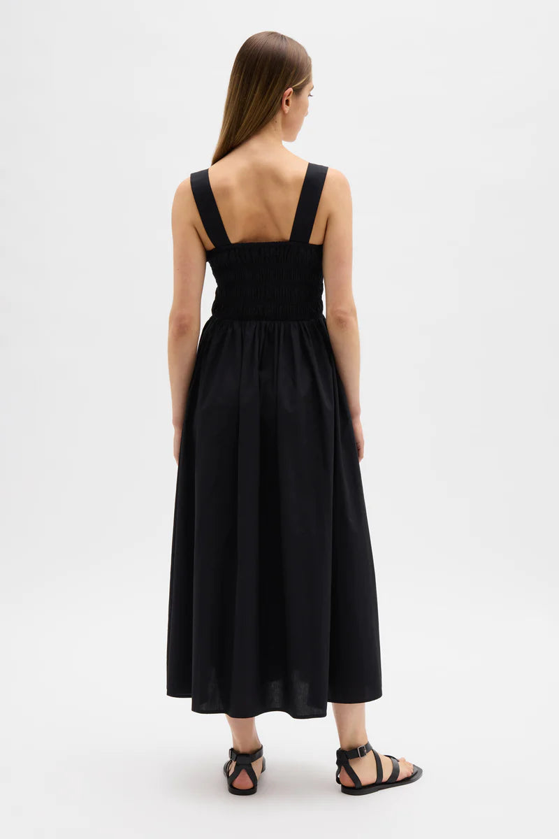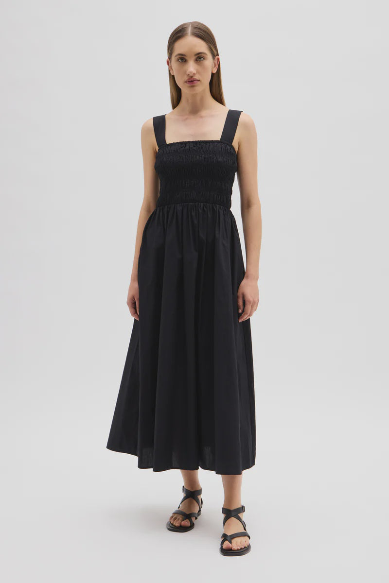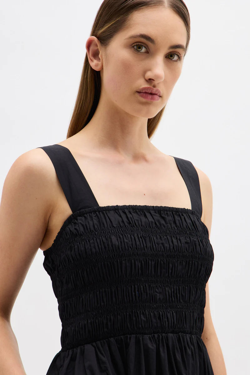 Assembly Label, Eline Dress in Black. Summer calls for dreamy cotton dresses that can be worn from day to night. Enter the Eline Dress, the perfect style for all occasions. This midi dress features a square neckline, a beautiful shirred bodice and a full skirt that dances around the body. This lightweight poplin dress is also designed wth pockets, and the white dress is lined.