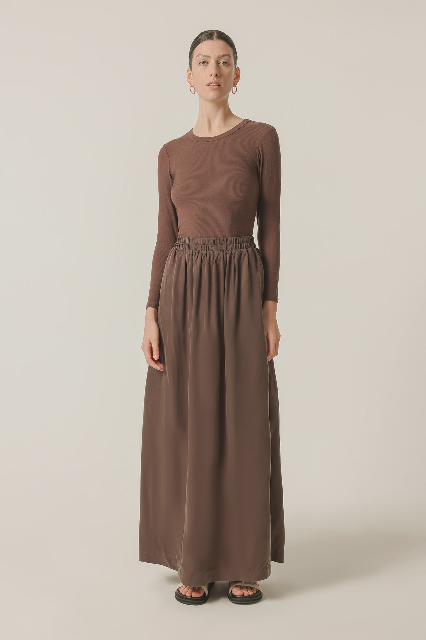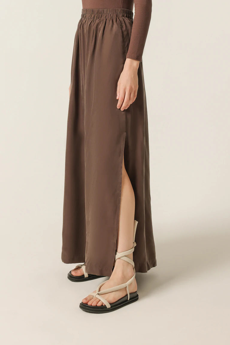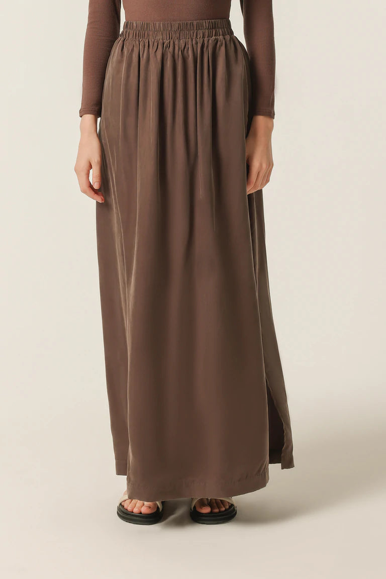 Gia Cupro Skirt Bark by Nude Lucy. Constructed in our signature cupro fabrication, the Gia Cupro Maxi is a full-length voluminous skirt sitting high on the waist. Features include a flat elastic waistband, functioning pockets and side slits.
