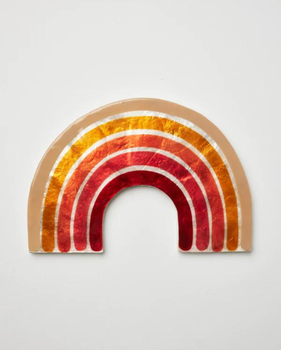 Golden Rainbow Red by Jones & Co. The Golden Rainbow Red showcases a super cute rainbow design that instantly brightens up any space. The vibrant colors of the rainbow symbolize hope, happiness, and unity, making them the perfect addition to your home decor. Style with other wall tiles in our collection or hang above a doorway for a sweet entrance and exit statement of love!L: 24cm W: 17cm H: 1cmCountry of Origin Paranaque, Philippines