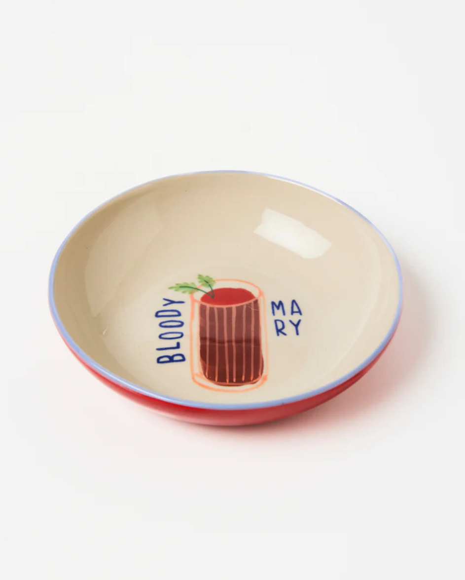 A little bit spicy and full of charm. This Bloody Mary snack bowl features a sky blue rim and tomato-red base - a playful cocktail motif in the centre. Ideal for celery sticks, anchovy olives or anything salty. Also: highly giftable.