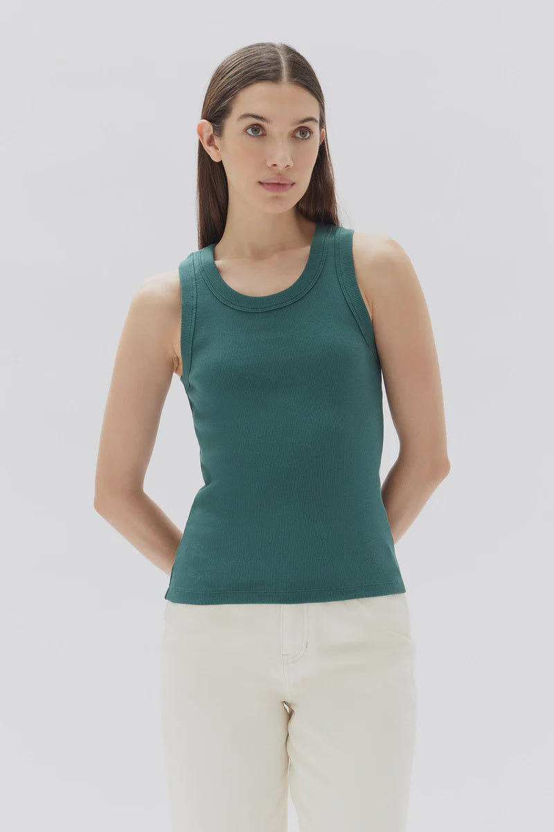 Assembly Label, Miana Rib Tank Lagoon. The Miana Organic Rib Tank is a basic everyday essential with a premium feel. This tank top is made from organic cotton with a soft ribbed finish and a hint of elastane that creates a stretchy fit. Its designed to sit close to the body, which makes this cotton tank versatile and easy to layer.