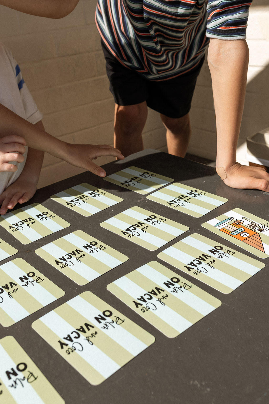 A cool & colourful, nostalgic deck of 56 kids playing cards (28 unique pairs) featuring heartfelt hand-drawn illustrations by Lulu Pawlik, of Palm (the playful palm tree) and Coco (the carefree coconut), on their favourite holiday adventures!