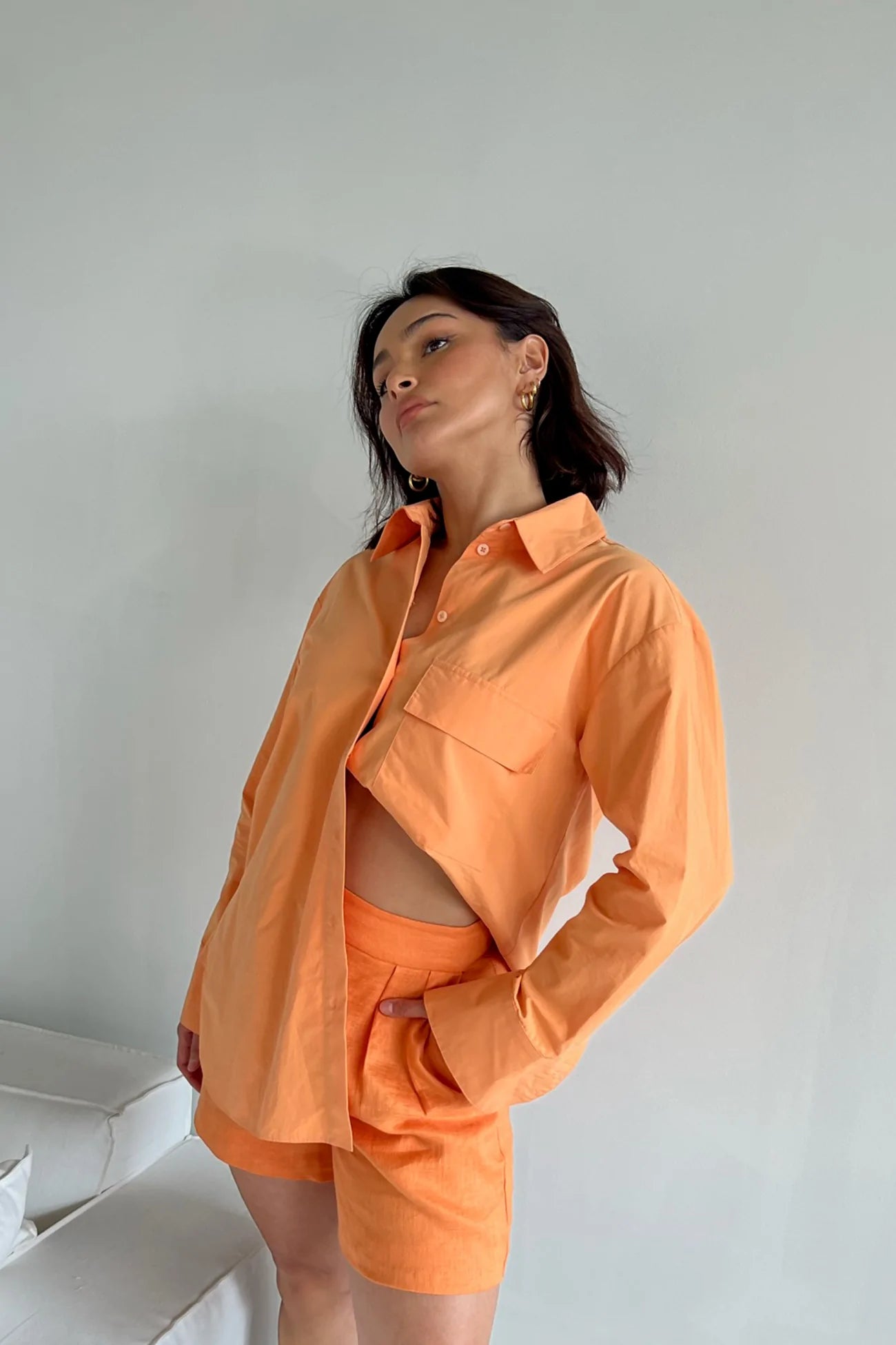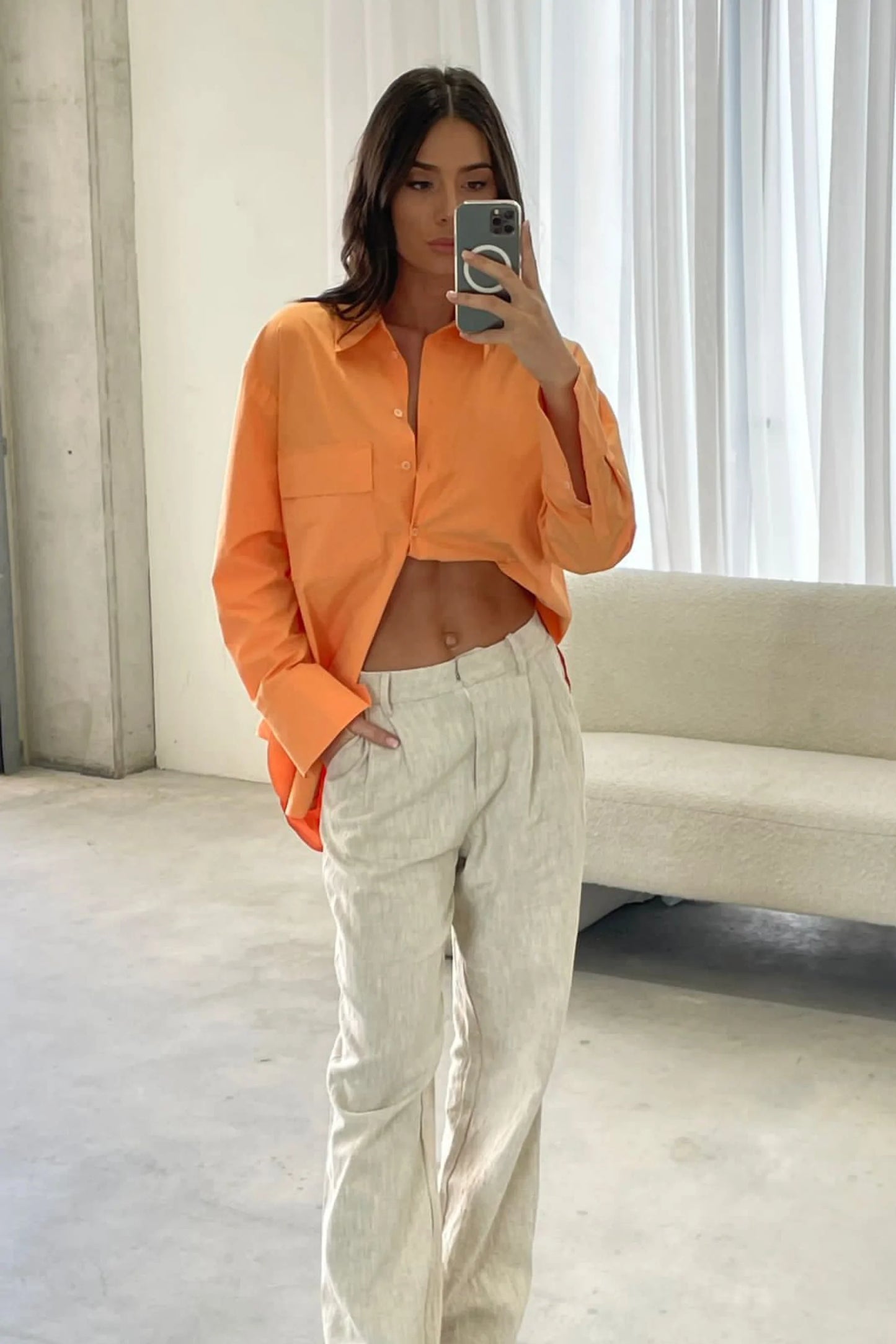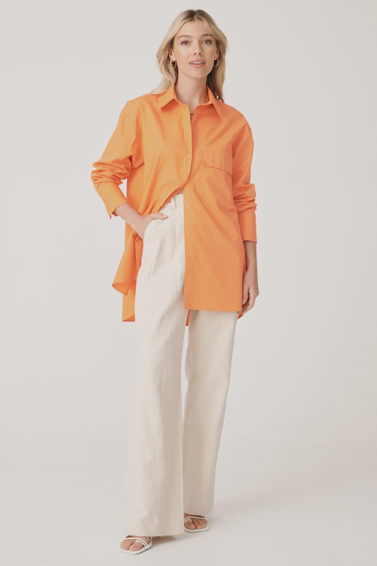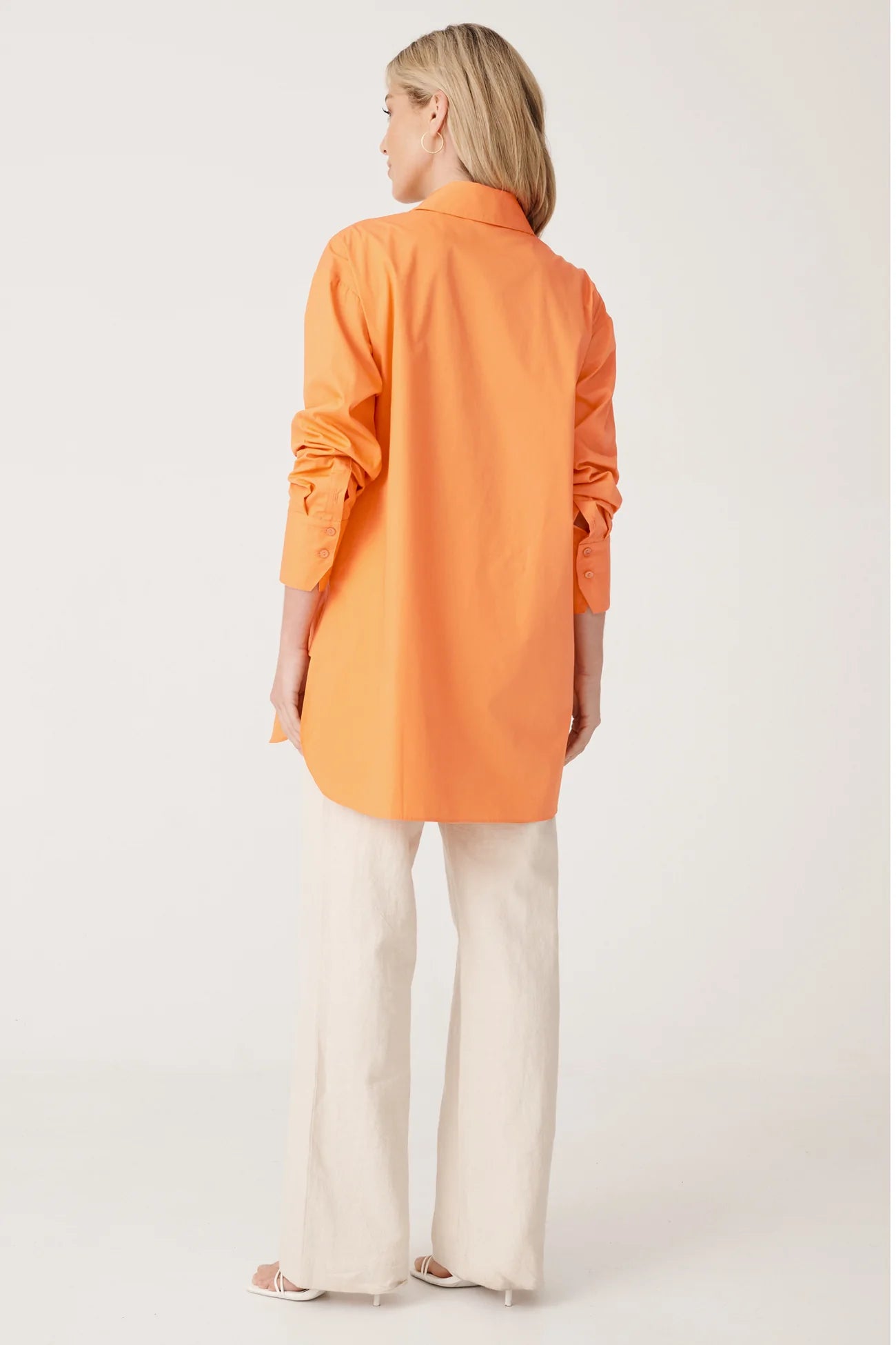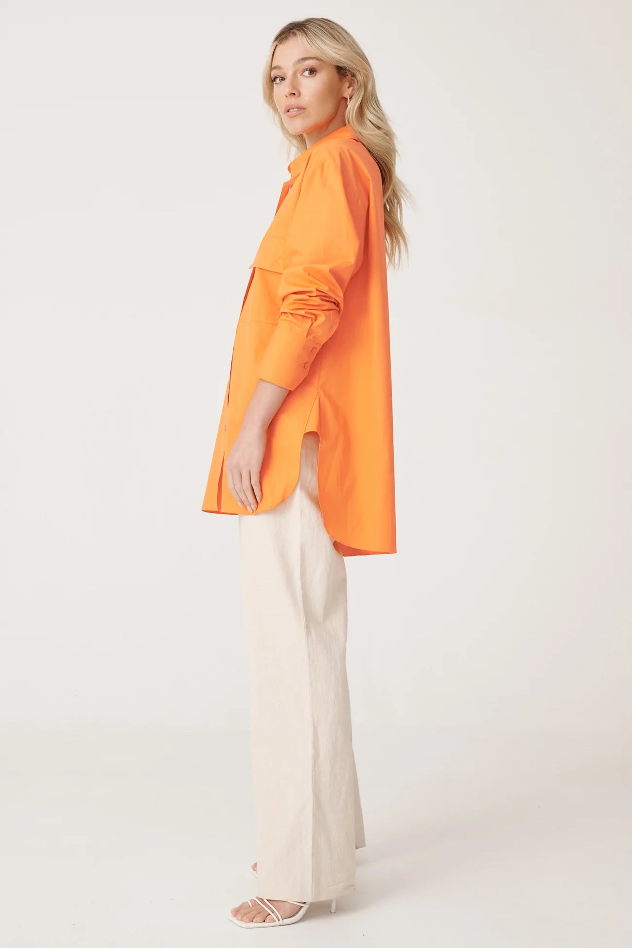 Scarlett Shirt Orange by Raef the Label. The Scarlett Shirt has been designed to have generous length through the body with a scooped side hem, making this shirt versatile and easy to style buttoned up or worn open over a tank top. Featuring a front patch pocket, exposed front buttons and traditional classic collar.