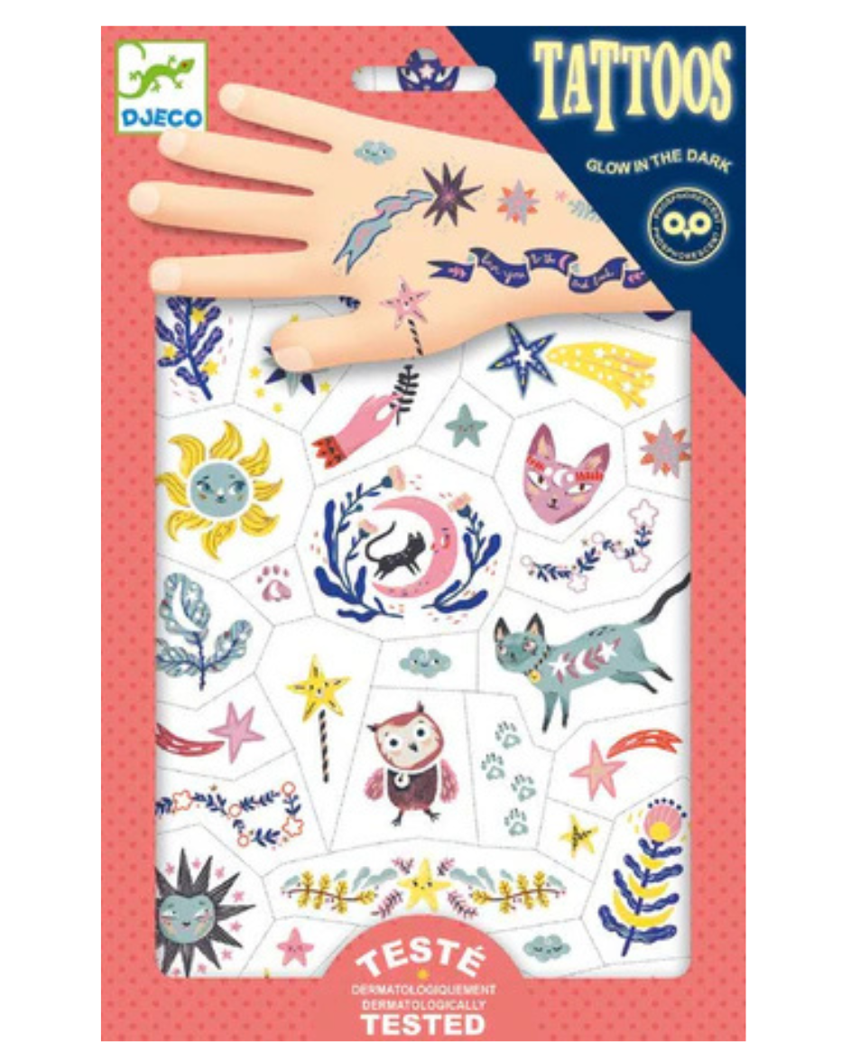 Delightful dream time designs feature on this set of two sheets of glow in the dark tattoos from Djeco! They are pre-cut, so they are easy to use: just apply a bit of water.