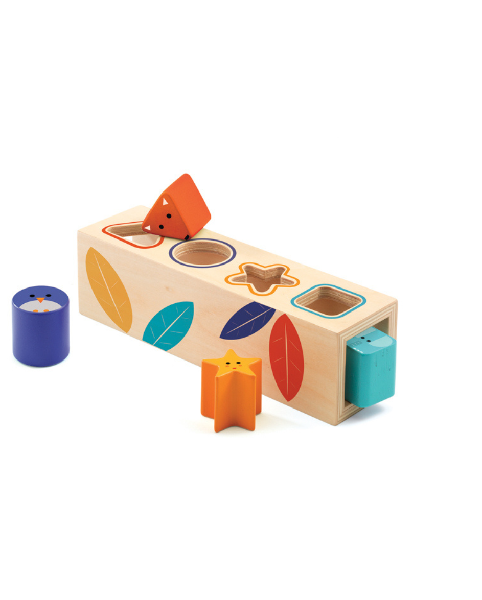 Djeco Boita Basic Wooden Puzzle shape Sorter. A sweet wooden shape sorter. This gorgeous set features leaf design on the side, triangle, circle, star and square wooden shapes. The wooden shapes feature adorable characters on them. Great for building fine motor skills and shape recognition.