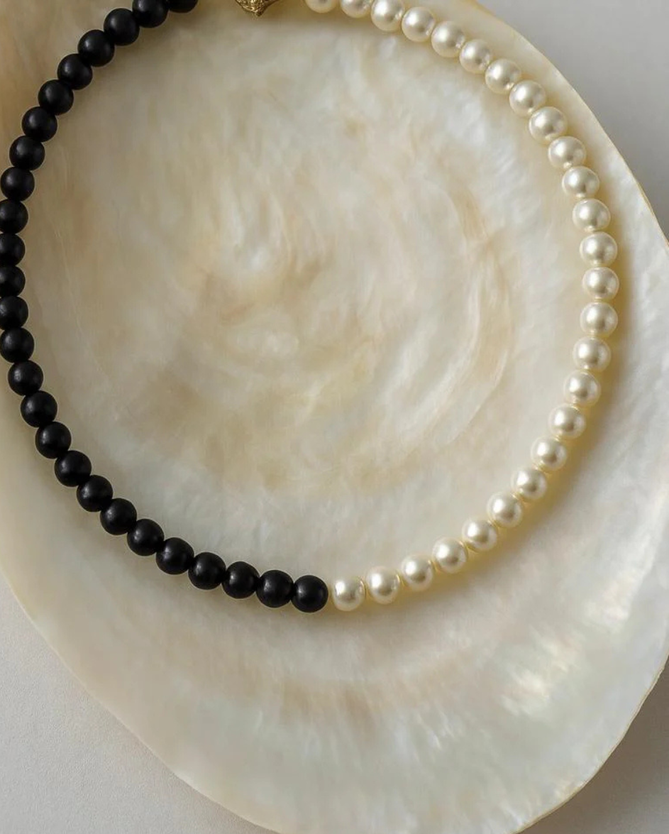 A striking two-tone necklace featuring smooth black and radiant white glass pearls, designed to symbolize balance, harmony, and effortless style. Perfect for adding a modern, minimalist touch to any outfit while keeping a timeless, elegant feel.