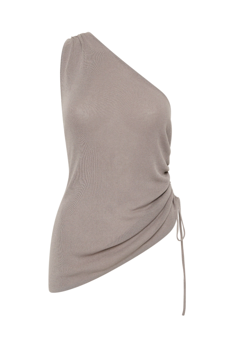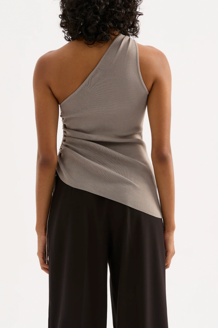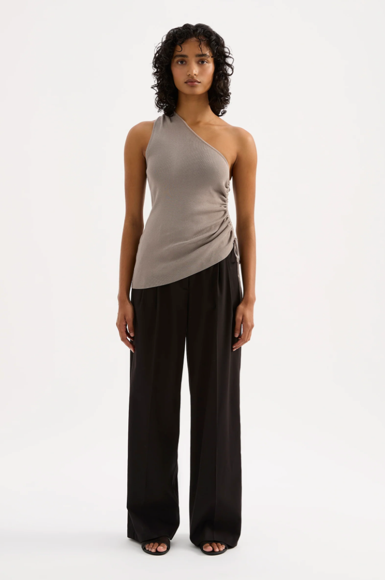 The Yumi Knit Top is made from a lightweight yarn that has a smooth dry handfeel. The one shoulder silhouette is asymmetric with length finishing at the hip. Features include a drawcord down side seam creating ruching across the body and a diagonal hem.